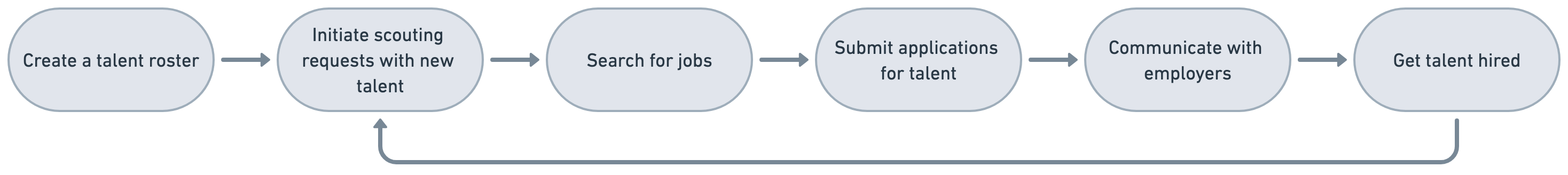An agent's workflow consist of three main tasks: 1. finding talent for their roster, 2. finding jobs suitable for their talent, and 3. submitting their talent for work. Regarding #1, some agents come to Backstage having an established roster of clients. Most however, are newer to the industry and need to build a roster from scratch. This can be a very drawn-out process, so it needs to be clearly visualized for the user on each side of the transaction. An important detail around item #3 is that agents (especially those with large rosters) frequently submit applications for several people for the same role at once. For this they need a very tailored version of the product that talent use to self-submit.