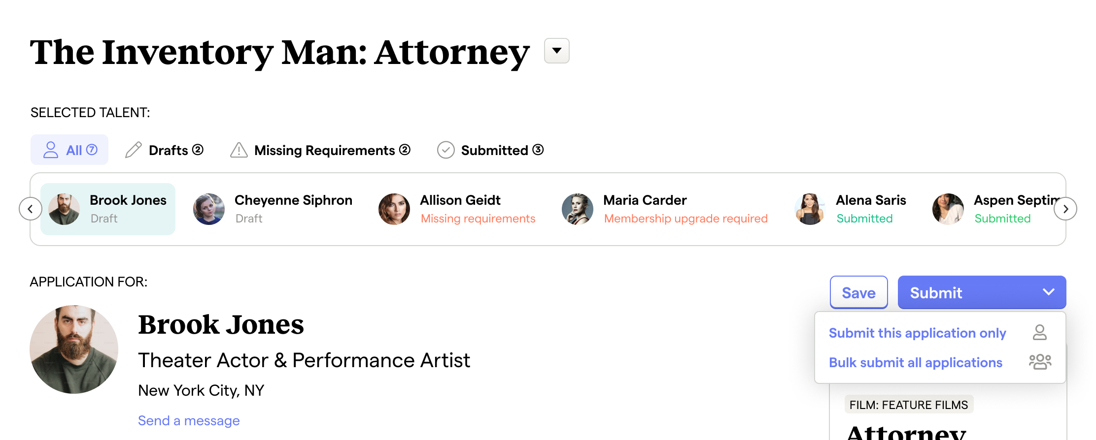 ↑ A status toolbar on the application screen makes it easy to see, navigate, and submit all the talent an agent has selected for a role.