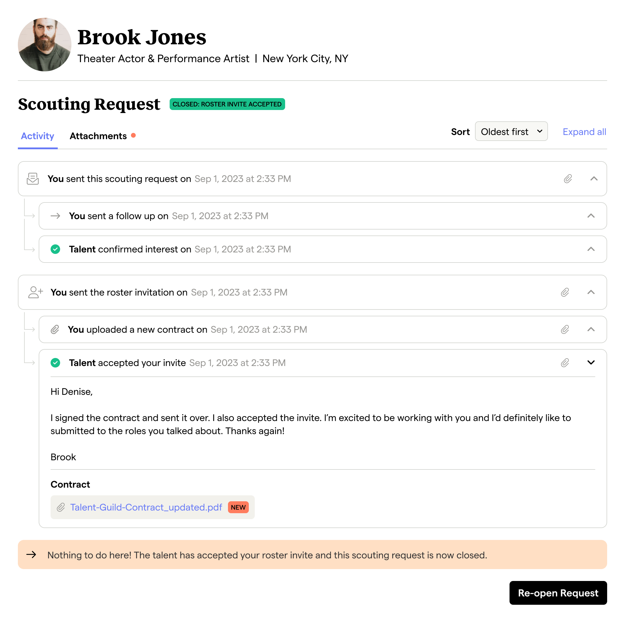 Building a talent roster can involve a lot of communication with a lot of different people. For the talent in particular it's important to be guided with specific, clearly defined steps and actions so they don't just jump at the first offer they receive. We do our best to vet agents that join the platform, but some opportunists can slip by, so safety and security are super important here. We convey this to talent through education in messaging with each step. Additionally, the interface we built lays out every part of the process and piece of communication so both parties have a record of the transaction.